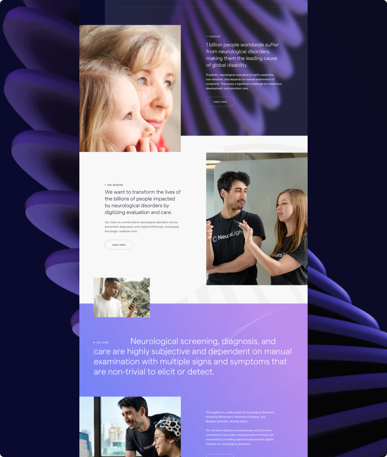 When NeuraLight approached Code Resolution® and partners to develop their website, they had a clear goal in mind. They wanted to create a website that would serve as a comprehensive resource for their target audience, highlighting their innovative AI technology and their current focus on neurological disorders such as Alzheimer’s, Parkinson’s Disease, ALS, and Multiple Sclerosis. They required the website to provide detailed information about the science, technology, and their company.